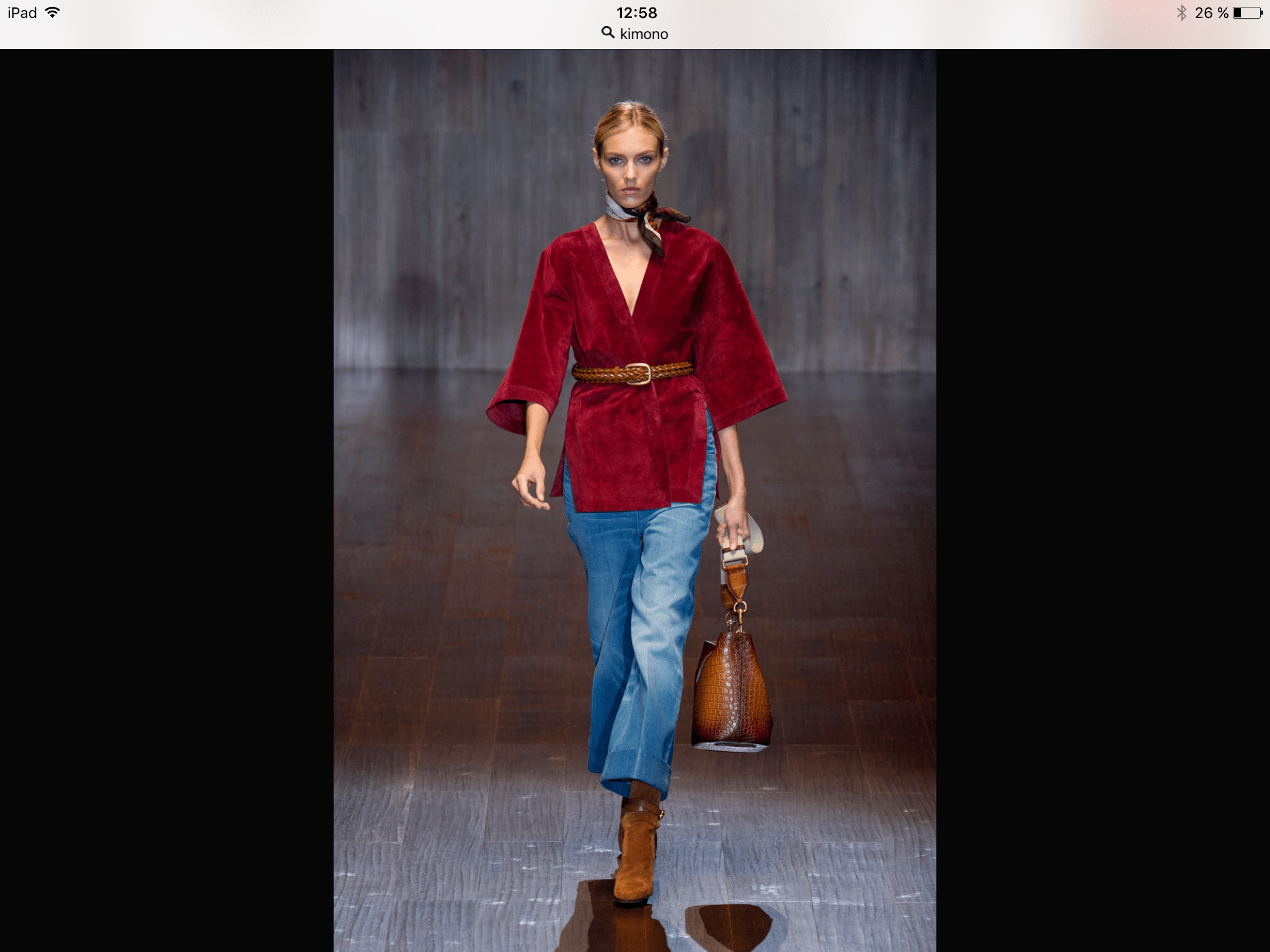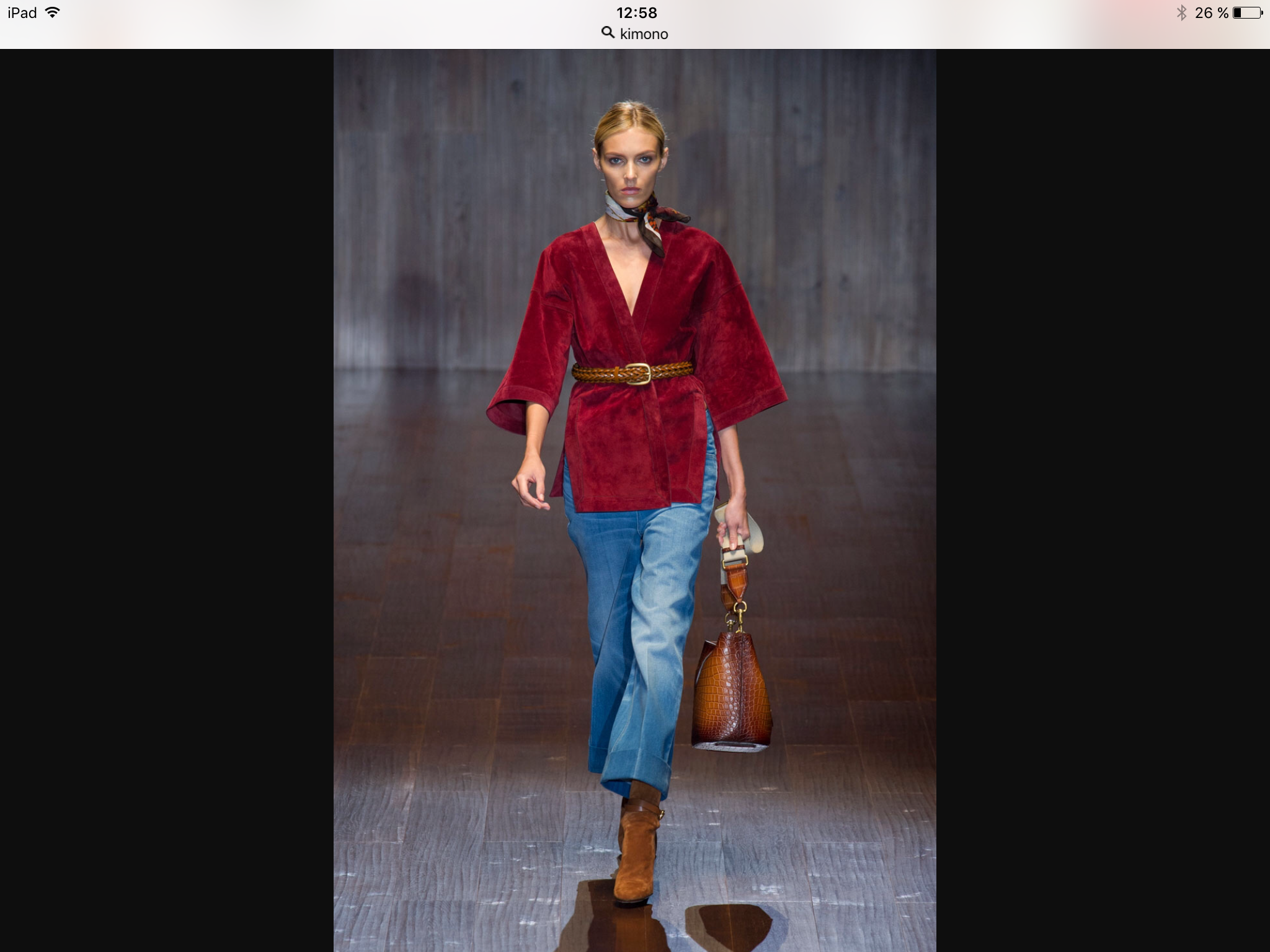 Veste en Daim Bordeaux coupe Kimono portée avec un jean flare 7/8 , petit foulard en soie noué autour du cou et bottines en daim ….je m’incline.