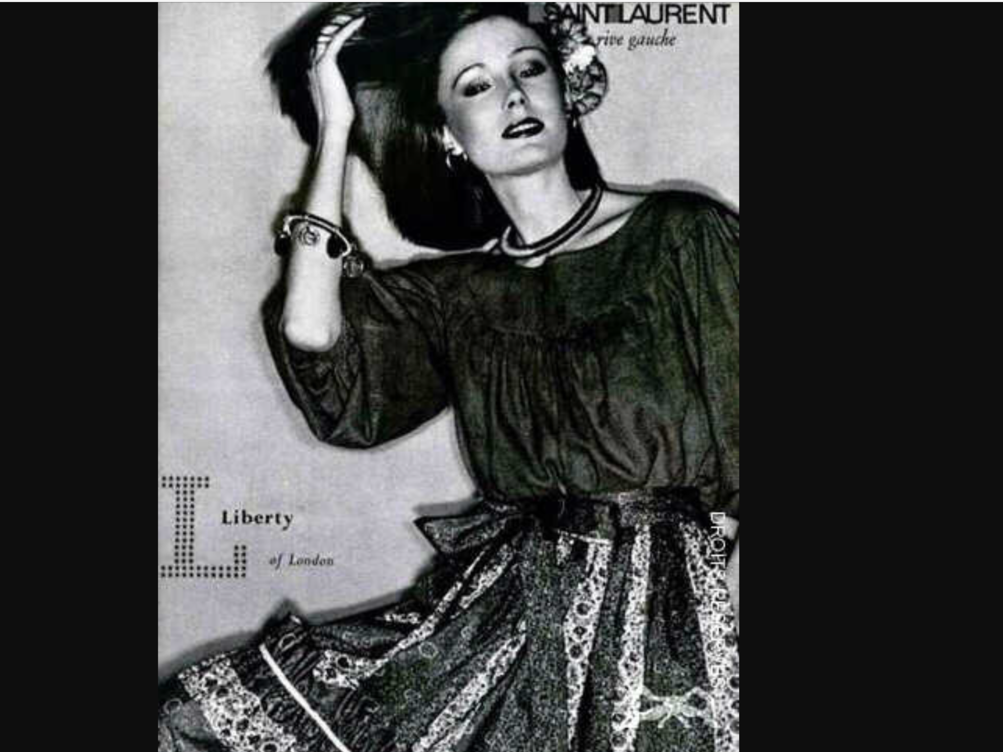 En 1960, Saint Laurent , ce grand précurseur ( Moi d’abord! Moi d’abord! Moi d’abord !) succombe au romantisme de l’imprimé Liberty et présente dans ses collections de longues jupes d’inspiration bohème aux motifs Liberty :