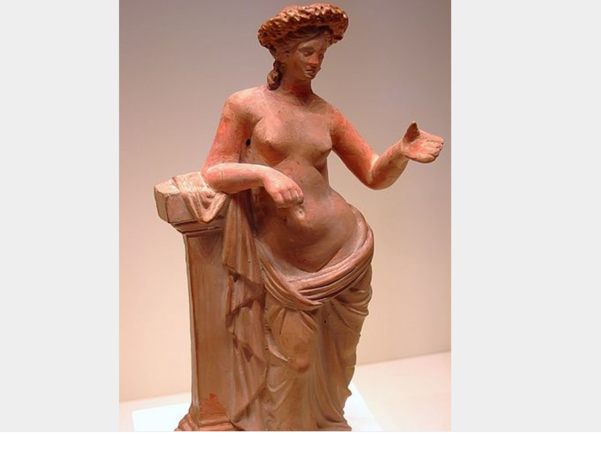 Ci-dessous un tanagra daté de 200 avant J.C , vous remarquerez la hanche généreuse et le ventre rebondi . Notez aussi le mouvement de sa main gauche : cela ne vous rappelle rien ?? Hmmm?? Cette main qui se tend : elle s’apprête à accepter une amphorette ( l’ancêtre de la coupette ) .